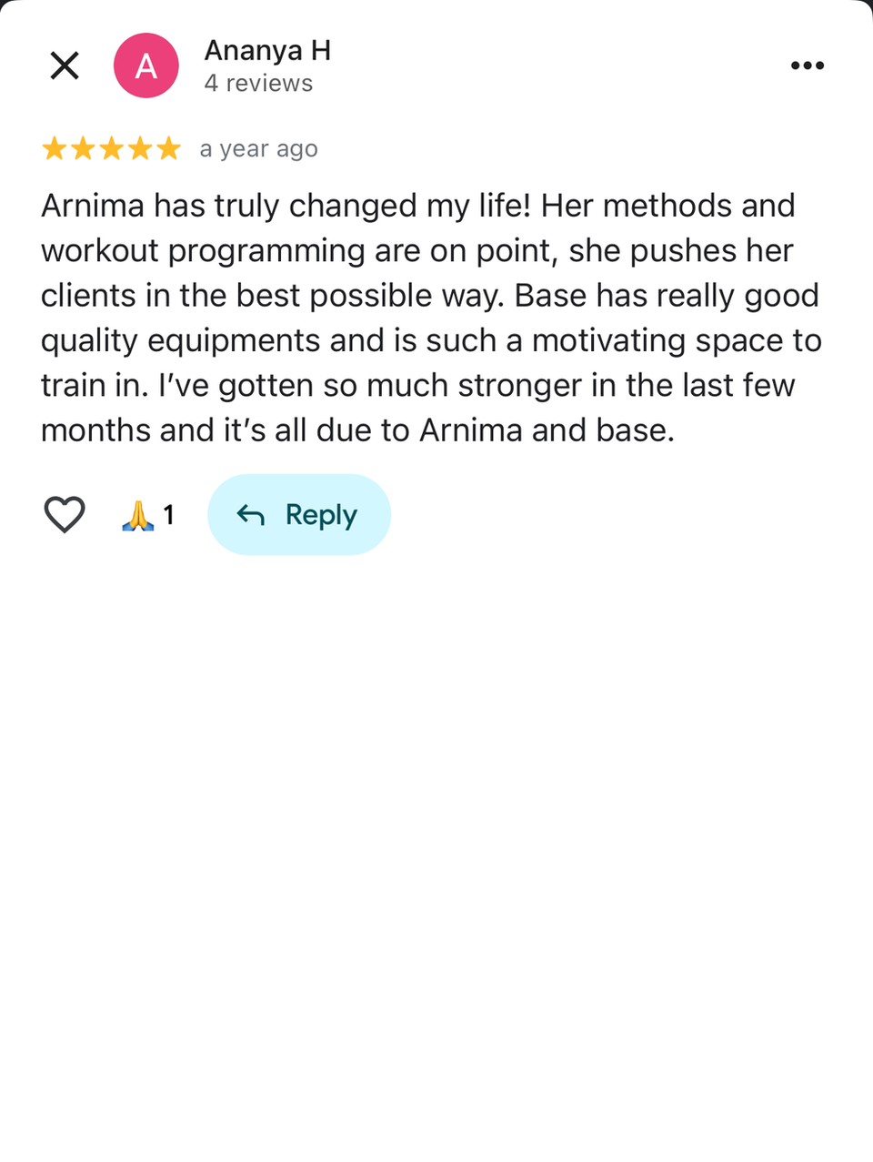 Stepping into BASE Personal Training GYM, I was warmly welcomed by the founder, Arnima. This isn’t your typical gym—it's unique and feels just like home. Their personal training sessions are incredible, tailored to each client's needs. I highly recommend BASE Personal Training GYM to anyone looking to boost their strength and transform their approach to weight training.